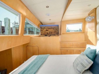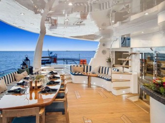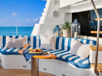 Blue Gryphon Sleeps 12 in 5 room and carries a crew of 4 to ensure a relaxed, luxury experience. The interior of Blue Gryphon is beautifully bright and spacious, decorated in simple blue/grey tones and light colors .The large windows bring in an abundance of natural light and provide beautiful views, giving her interior space great light and an airy comfortable feeling. There is a lounge area with a large U-shaped sofa and an ottoman/bench around a coffee table. The formal dining area is separate with a large table and comfortable seating for all guests.