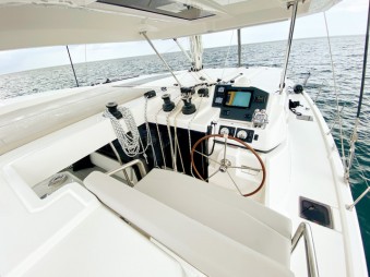 The Leopard 45 features a raised helm station covered by a hardtop bimini, with direct access from the cockpit and side deck. All sailing lines lead to easily accessible winches, the primary winches being electric, and operated by footswitches.