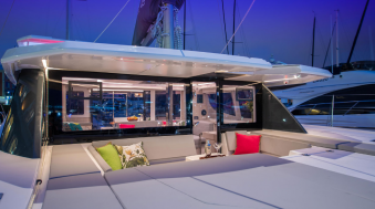 The exterior styling has evolved into a sharper, more angular look, topped by a sleek new saloon hard top, which extends from the aft cockpit to the forward cockpit. Spacious, practical and protected from the sun, the aft deck offers the perfect entertainment area with its ample seating and a clear natural flow through the open plan saloon. Accessible via a weather tight door, the increased forward cockpit provides easy access to the fore deck and trampoline. Additionally, the forward cockpit allows for superior ventilation naturally throughout the boat.
