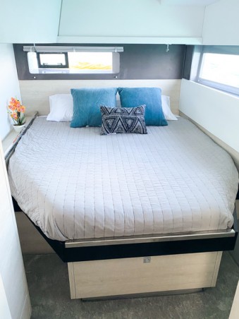 In the 3-Cabin ‘owner’s version,’ the entire starboard hull is dedicated to a spacious owner’s suite with a master cabin, study desk/ vanity and a private head with a large shower stall. In comparison to it’s predecessor, the volume below deck has been increased, making it open and unrestricted. The port side boats two beautiful queen size cabins, each with their own head with separate shower.
