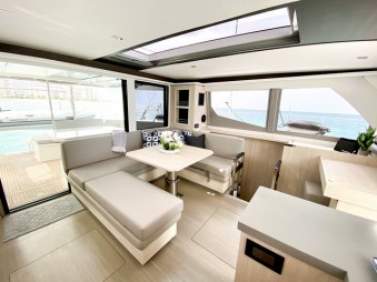 The Leopard 45 has been overhauled with full wrap around panoramic windows, a saloon size overhead skylight and enlarged hull windows. The interior design is modern and simple with an elegant, light finish and grey accent panels. The increased volume of the saloon provides ample space for on-board entertaining.