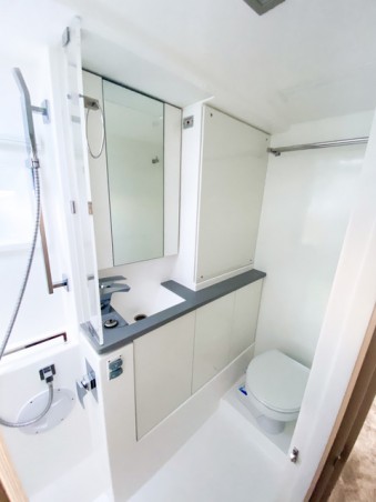 The modern galley boasts corian countertops, a stainless steel sink with single lever mixer faucet with pull-out spray, a two drawer, front-opening stainless fridge and freezer, as well as a three burner stove top and oven. Onboard entertaining is accentuated with ample dining space, and forward facing L shaped seating communicating directly with the galley, situated forward. Wide sliding saloon doors afford panoramic views towards the stern, allowing the interior saloon to flow naturally towards the outside aft and forward cockpit.