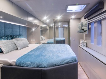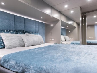 Samadhi’s generous total living space equalling 225 m2 comfortably accommodates 8 guests in the opulent master suite with a walk-in closet and 3 spacious elegant guest cabins. The finest organic bedding with a super soft hand will make each night on board luxuriously comfortable. The guests will surely appreciate the airy fashionable bright saloon with the modern galley designed in captivating eye-catching water colours. Fresh aquamarine shades and tints create a feeling of spaciousness of the infinite sky and breadth of a boundless sea.
