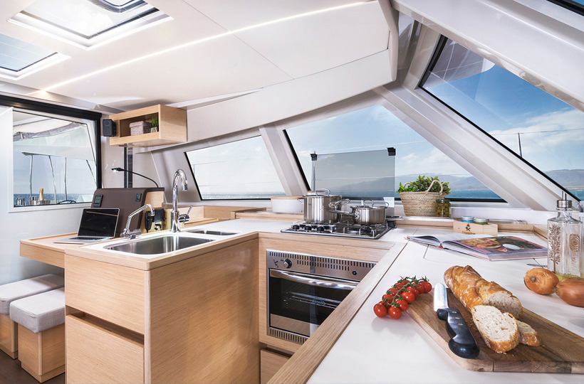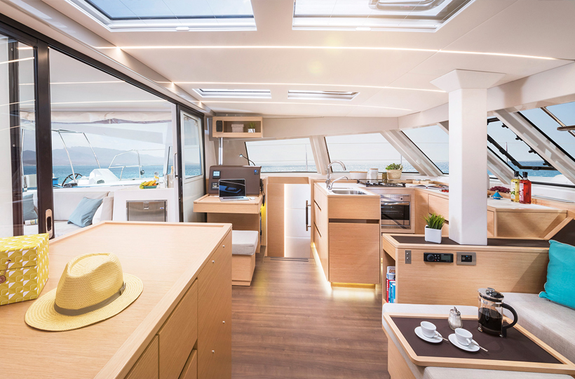“Susie Sea” has twin helms, one at the aft end of each hull, to allow for greater visibility when docking on either side. The working lines are run aft inboard of the helm. Directions to crew members assisting with lines can be communicated clearly as your position is more sheltered compared to the more common raised/flybridge helms. While the main socializing areas are at the back of the boat, plenty of cushioned lounging and sunbathing opportunities are found forward on the safety net. Each area has shade – a hardtop bimini aft and a removable sun shade forward.