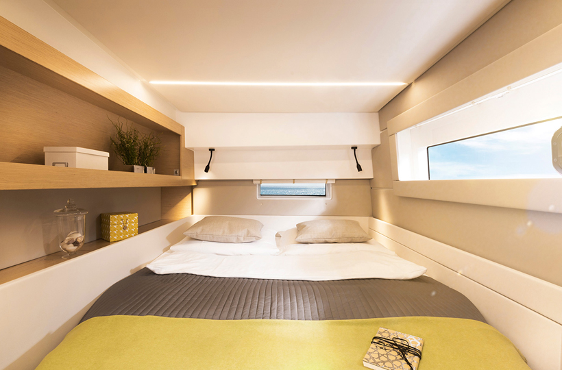 This is a boat that offers a generous amount of space, equivalent to a respectably-sized apartment, and uses that space in a flexible manner. Sliding doors in the main saloon open entirely to the aft cockpit making it feel luxurious and spacious. Leather upholstery and upgraded finishes complete the feeling of upscale, modern comfort. In the large galley there is an additional Fridge and freezer unit. Throughout the boat there is an impressive volume of easily-accessed storage space, as well as ample room to move around without getting in the way of other people. Four en-suite staterooms with excellent natural light and ventilation will provide accommodation for up to eight guests. The four suites share two full-sized showers which creates far more space in the heads than typically four-cabin boats. The adjoining doors can be locked from both sides to ensure privacy. A single crew berth in the port v-berth provides accommodation for an additional crew member or hired captain.