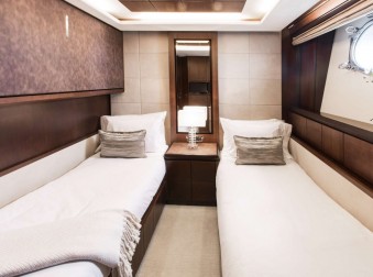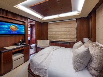 The owner’s private master suite is fully separate with a private staircase leading below amidships with King size bed, sitting chairs, small self-service bar, and safe. The large en suite bathroom has a bathtub and separate jet rain shower, twin sinks.