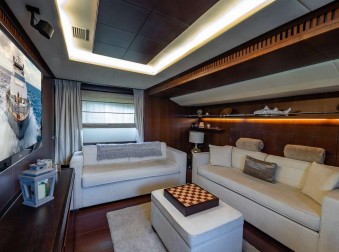 On the main deck, there is a media room forward which has a convertible sofa bed (double) and a day head just opposite with a jet shower which closes off to make a private cabin. There is an additional day head on the main deck.